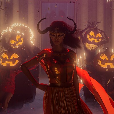 A fantastical Halloween summoning set against the backdrop of the Alhambra courtyard.